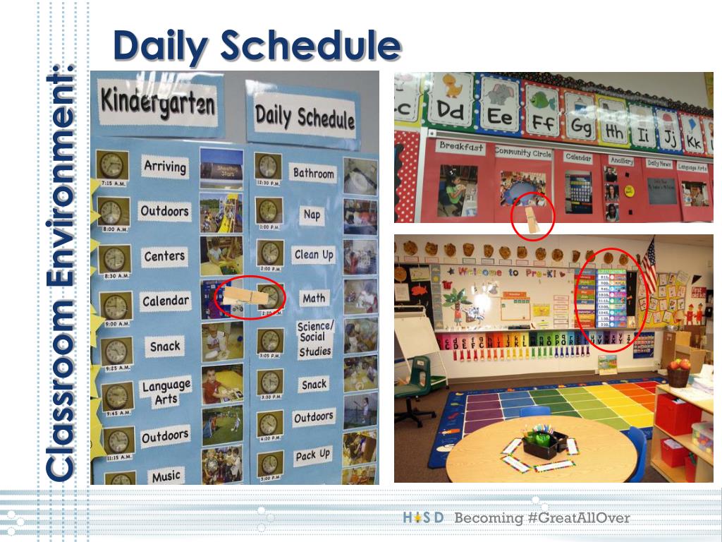 Daily Schedule Classroom Environment: We have a daily schedule at the back of the room but I don’t know what the words say… 1- There is no daily schedule evident. 2- There is a daily schedule that is not easily accessible to students. Schedule may lack pictures and/or icons. 3- Daily schedule is accessible to students and is displayed at their eye level. There is a clip that is moved as students progress through their day. There are pictures/icons for every activity. 4- Daily schedule is accessible to students and is displayed at their eye level. Students demonstrate ownership by moving a clip on the schedule as they progress through their day. There are relevant photos for every activity.