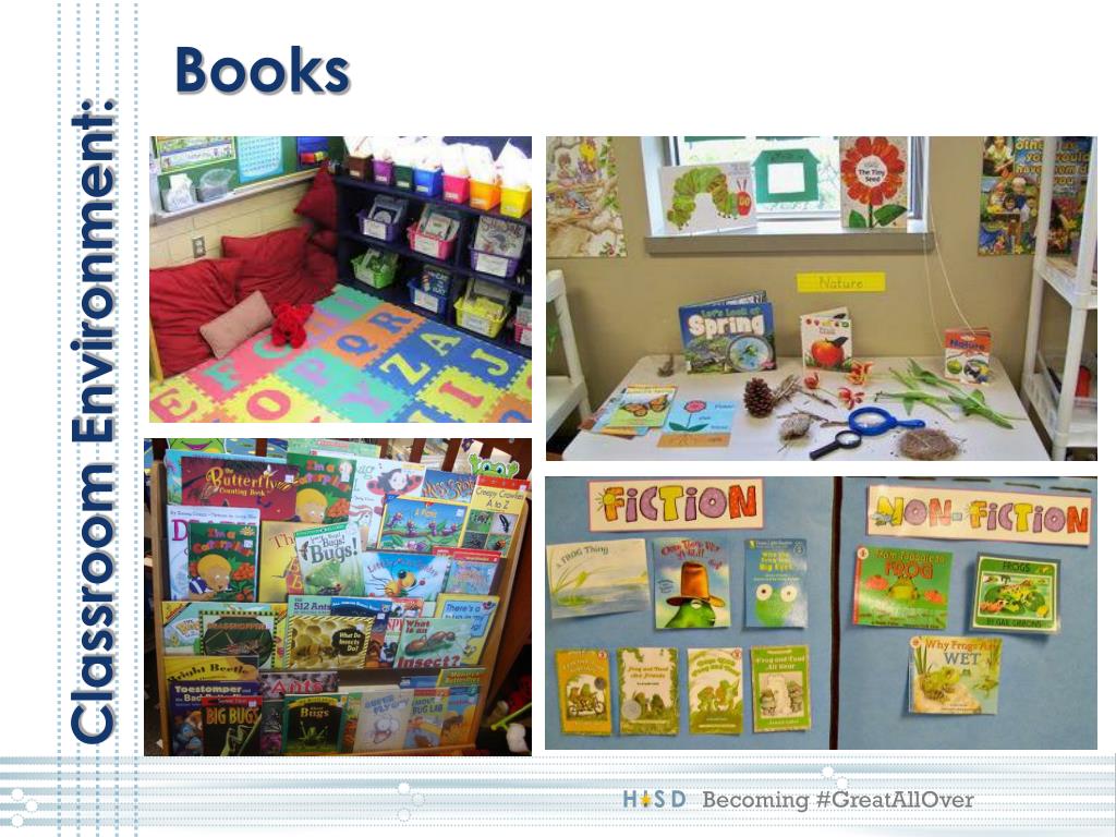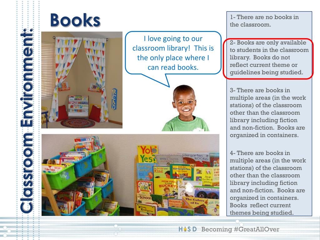 Books I love going to our classroom library! This is the only place where I can read books. Classroom Environment: 1- There are no books in the classroom. 2- Books are only available to students in the classroom library. Books do not reflect current theme or guidelines being studied. 3- There are books in multiple areas (in the work stations) of the classroom other than the classroom library including fiction and non-fiction. Books are organized in containers. 4- There are books in multiple areas (in the work stations) of the classroom other than the classroom library including fiction and non-fiction. Books are organized in containers. Books reflect current themes being studied.