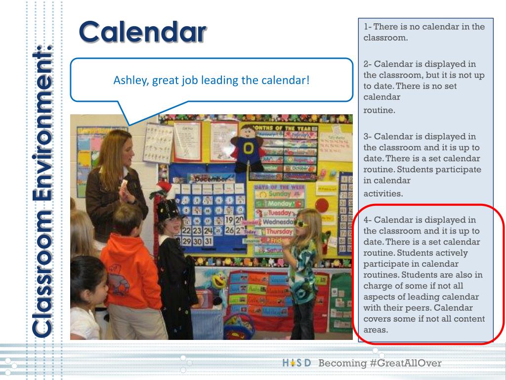 Calendar Ashley, great job leading the calendar! Classroom Environment: 1- There is no calendar in the classroom. 2- Calendar is displayed in the classroom, but it is not up to date. There is no set calendar routine. 3- Calendar is displayed in the classroom and it is up to date. There is a set calendar routine. Students participate in calendar activities. 4- Calendar is displayed in the classroom and it is up to date. There is a set calendar routine. Students actively participate in calendar routines. Students are also in charge of some if not all aspects of leading calendar with their peers. Calendar covers some if not all content areas.