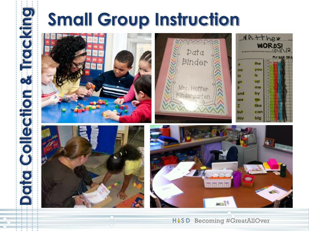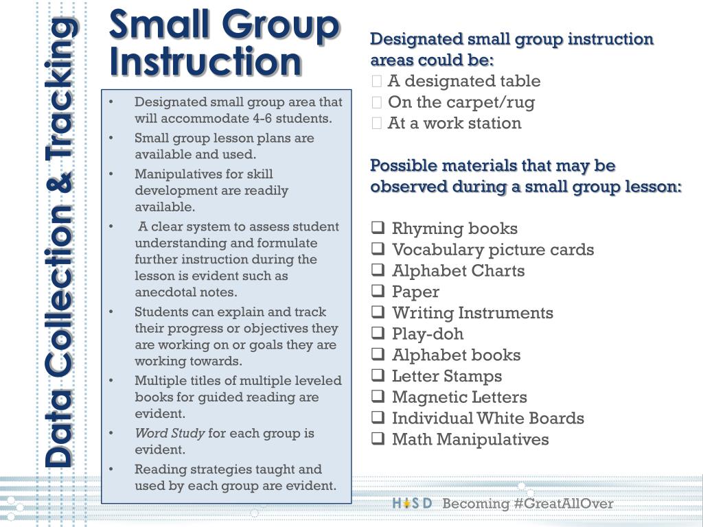 Designated small group instruction areas could be: • A designated table • On the carpet/rug • At a work station • Possible materials that may be observed during a small group lesson: • Rhyming books • Vocabulary picture cards • Alphabet Charts • Paper • Writing Instruments • Play-doh • Alphabet books • Letter Stamps • Magnetic Letters • Individual White Boards • Math Manipulatives Small Group Instruction Data Collection & Tracking • Designated small group area that will accommodate 4-6 students. • Small group lesson plans are available and used. • Manipulativesfor skill development are readily available. • A clear system to assess student understanding and formulate further instruction during the lesson is evident such as anecdotal notes. • Students can explain and track their progress or objectives they are working on or goals they are working towards. • Multiple titles of multiple leveled books for guided reading are evident. • Word Study for each group is evident. • Reading strategies taught and used by each group are evident.