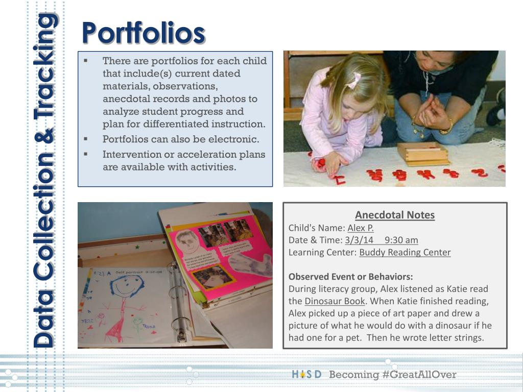 Portfolios Data Collection & Tracking • Anecdotal Notes • Child's Name: Alex P. • Date & Time: 3/3/14 9:30 am • Learning Center: Buddy Reading Center • Observed Event or Behaviors: • During literacy group, Alex listened as Katie read the Dinosaur Book. When Katie finished reading, Alex picked up a piece of art paper and drew a picture of what he would do with a dinosaur if he had one for a pet. Then he wrote letter strings. There are portfolios for each child that include(s) current dated materials, observations, anecdotal records and photos to analyze student progress and plan for differentiated instruction. Portfolios can also be electronic. Intervention or acceleration plans are available with activities.