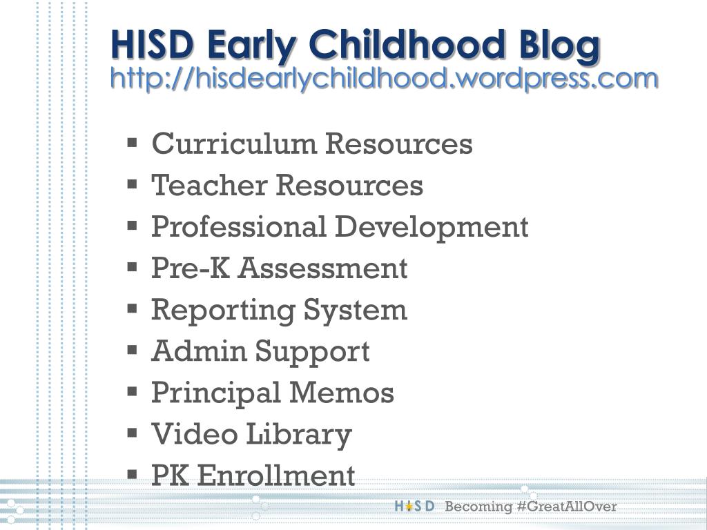 HISD Early Childhood Blog http://hisdearlychildhood.wordpress.com Curriculum Resources Teacher Resources Professional Development Pre-K Assessment Reporting System Admin Support Principal Memos Video Library PK Enrollment