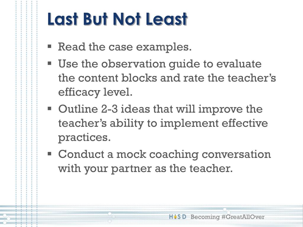 Last But Not Least Read the case examples. Use the observation guide to evaluate the content blocks and rate the teacher’s efficacy level. Outline 2-3 ideas that will improve the teacher’s ability to implement effective practices. Conduct a mock coaching conversation with your partner as the teacher.