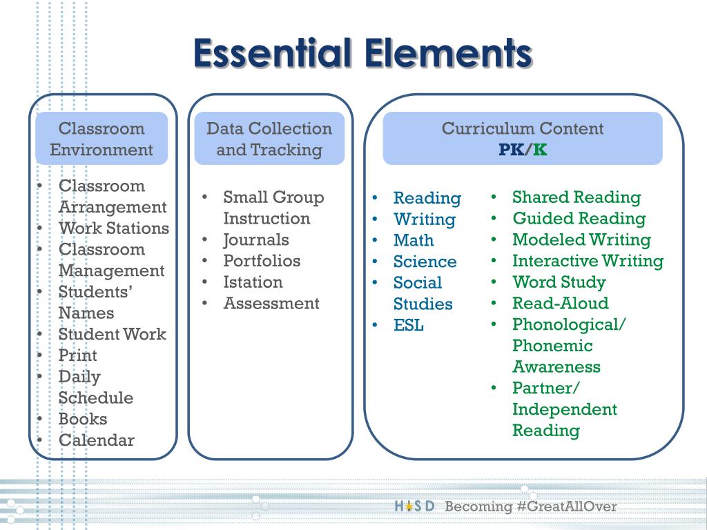 Essential Elements Classroom Environment Data Collection and Tracking Curriculum Content PK/K • Classroom Arrangement • Work Stations • Classroom Management • Students’ Names • Student Work • Print • Daily Schedule • Books • Calendar • Small Group Instruction • Journals • Portfolios • Istation • Assessment • Shared Reading • Guided Reading • Modeled Writing • Interactive Writing • Word Study • Read-Aloud • Phonological/ • Phonemic • Awareness • Partner/ • Independent • Reading • Reading • Writing • Math • Science • Social Studies • ESL