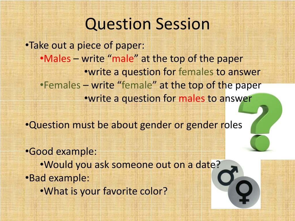 Question Session • Take out a piece of paper: • Males – write “male” at the top of the paper • write a question for females to answer • Females – write “female” at the top of the paper • write a question for males to answer • Question must be about gender or gender roles • Good example: • Would you ask someone out on a date? • Bad example: • What is your favorite color?