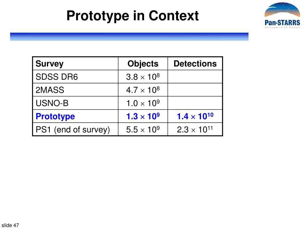 Number of Objects * “SDSS” includes a mirror of 11.3 < < 30 objects to < 0 Total GB of csv loaded data: 300 GB CSV Bulk insert load: 8 MB/s Binary Bulk insert: 18-20 MB/s CreationStarted: October 15th 2007 Finished: October 29th 2007 (??) Includes • 10 epochs of P2PsfFits detections • 1 epoch of Stack detections