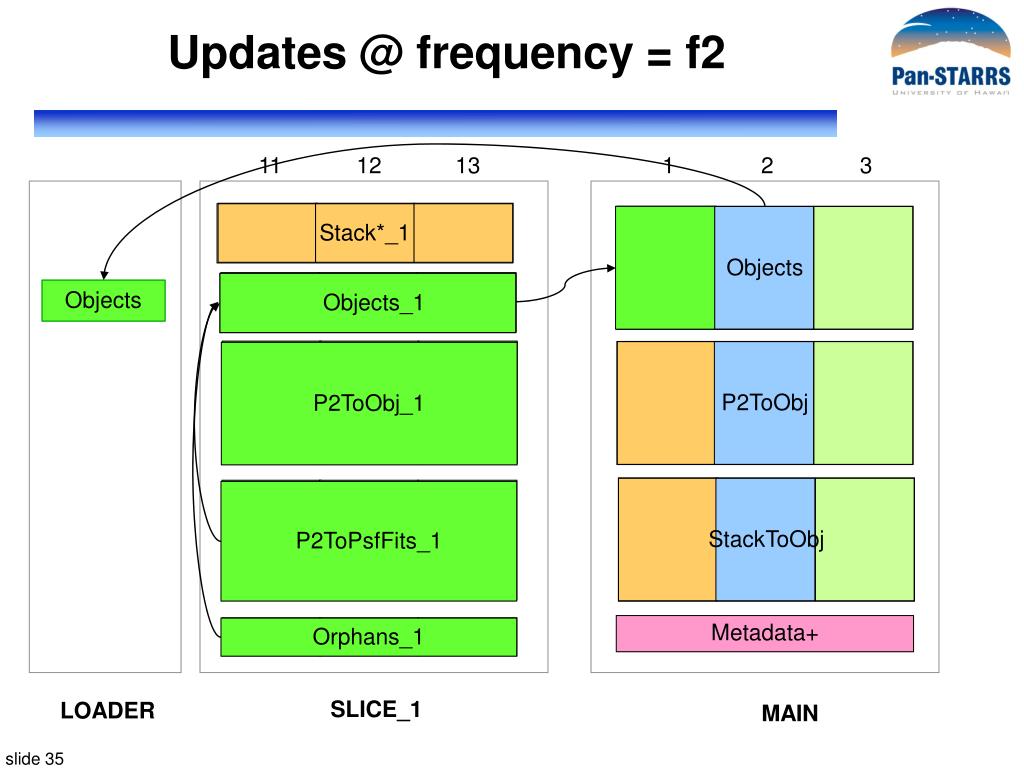 Updates @ frequency = f2 StackToObj P2ToObj Objects 1 11 2 12 13 3 Objects Objects_1 P2ToPsfFits_1 Stack*_1 Orphans_1 P2ToObj_1 Objects_1 Objects Metadata+ SLICE_1 LOADER MAIN