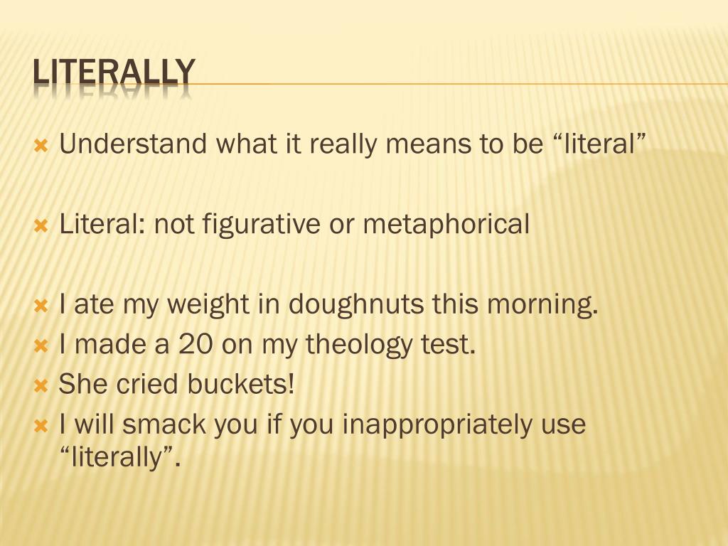 Understand what it really means to be “literal” Literal: not figurative or metaphorical I ate my weight in doughnuts this morning. I made a 20 on my theology test. She cried buckets! I will smack you if you inappropriately use “literally”. Literally
