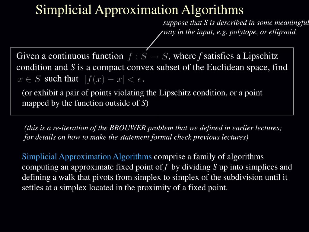 Simplicial Approximation Algorithms suppose that S is described in some meaningful way in the input, e.g. polytope, or ellipsoid Given a continuous function , where fsatisfies a Lipschitz condition and S is a compact convex subset of the Euclidean space, find such that . . (or exhibit a pair of points violating the Lipschitz condition, or a point mapped by the function outside of S) (this is a re-iteration of the BROUWER problem that we defined in earlier lectures; for details on how to make the statement formal check previous lectures) Simplicial Approximation Algorithms comprise a family of algorithms computing an approximate fixed point of f by dividing S up into simplices and defining a walk that pivots from simplex to simplex of the subdivision until it settles at a simplex located in the proximity of a fixed point.