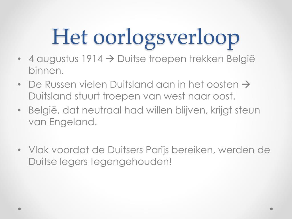 Het oorlogsverloop • 4 augustus 1914 Duitse troepen trekken België binnen. • De Russen vielen Duitsland aan in het oosten Duitsland stuurt troepen van west naar oost. • België, dat neutraal had willen blijven, krijgt steun van Engeland. • Vlak voordat de Duitsers Parijs bereiken, werden de Duitse legers tegengehouden!