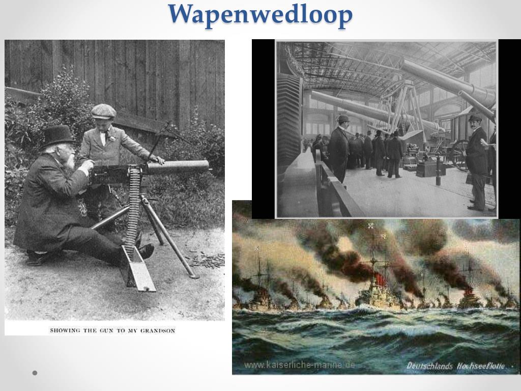 Oorzaken • Imperialisme / Race om de koloniën. • Militarisme (m.n. in Dld.). • Bondgenootschappen. • Wapenwedloop (vloot Dld., nieuwe wapens). • Nationalisme (één groot Slavisch rijk spanningen op de Balkan). • revanche (wraak-) gedachte (Fr-Dld/ 1870).