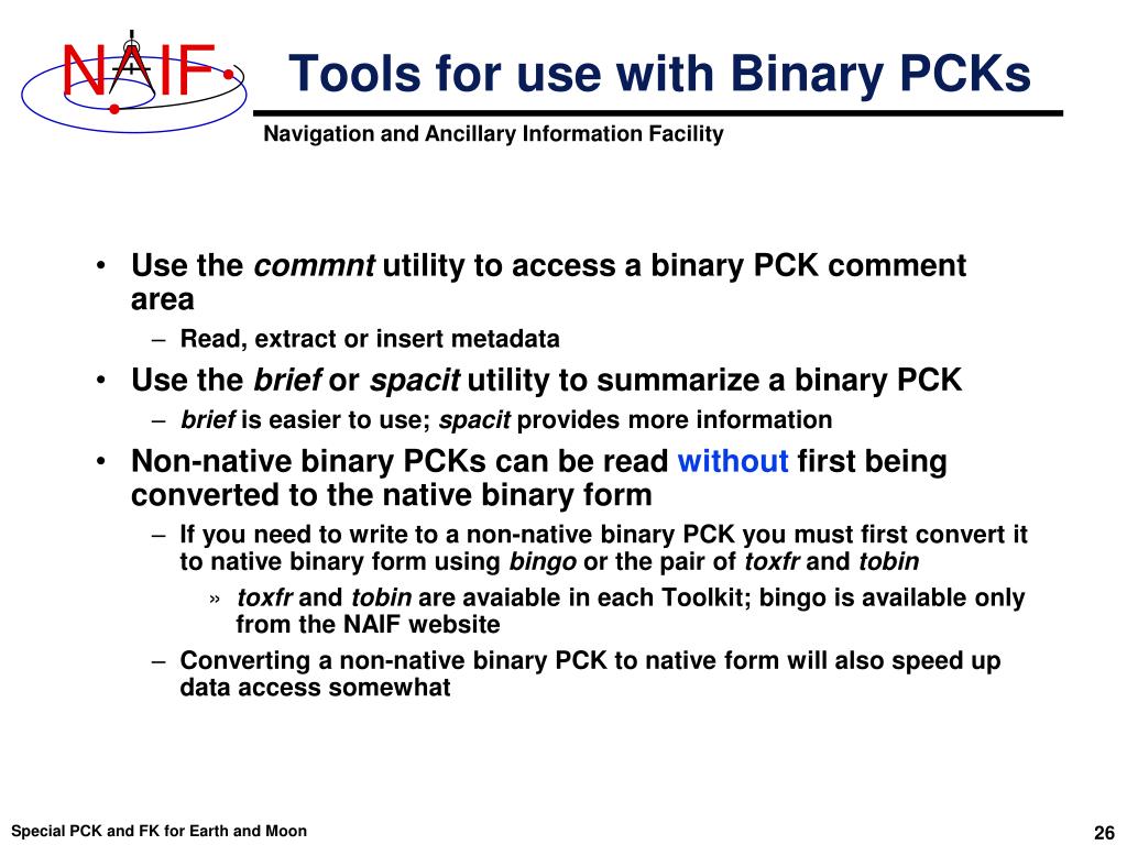 Tools for use with Binary PCKs • Use the commnt utility to access a binary PCK comment area • Read, extract or insert metadata • Use the brief or spacit utility to summarize a binary PCK • brief is easier to use; spacit provides more information • Non-native binary PCKs can be read without first being converted to the native binary form • If you need to write to a non-native binary PCK you must first convert it to native binary form using bingo or the pair of toxfr and tobin • toxfr and tobin are avaiable in each Toolkit; bingo is available only from the NAIF website • Converting a non-native binary PCK to native form will also speed up data access somewhat Special PCK and FK for Earth and Moon