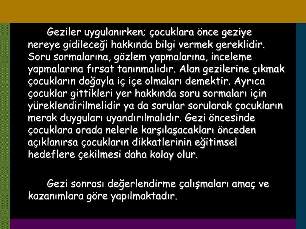 Geziler uygulanırken; çocuklara önce geziye nereye gidileceği hakkında bilgi vermek gereklidir. Soru sormalarına, gözlem yapmalarına, inceleme yapmalarına fırsat tanınmalıdır. Alan gezilerine çıkmak çocukların doğayla iç içe olmaları demektir. Ayrıca çocuklar gittikleri yer hakkında soru sormaları için yüreklendirilmelidir ya da sorular sorularak çocukların merak duyguları uyandırılmalıdır. Gezi öncesinde çocuklara orada nelerle karşılaşacakları önceden açıklanırsa çocukların dikkatlerinin eğitimsel hedeflere çekilmesi daha kolay olur. Gezi sonrası değerlendirme çalışmaları amaç ve kazanımlara göre yapılmaktadır.