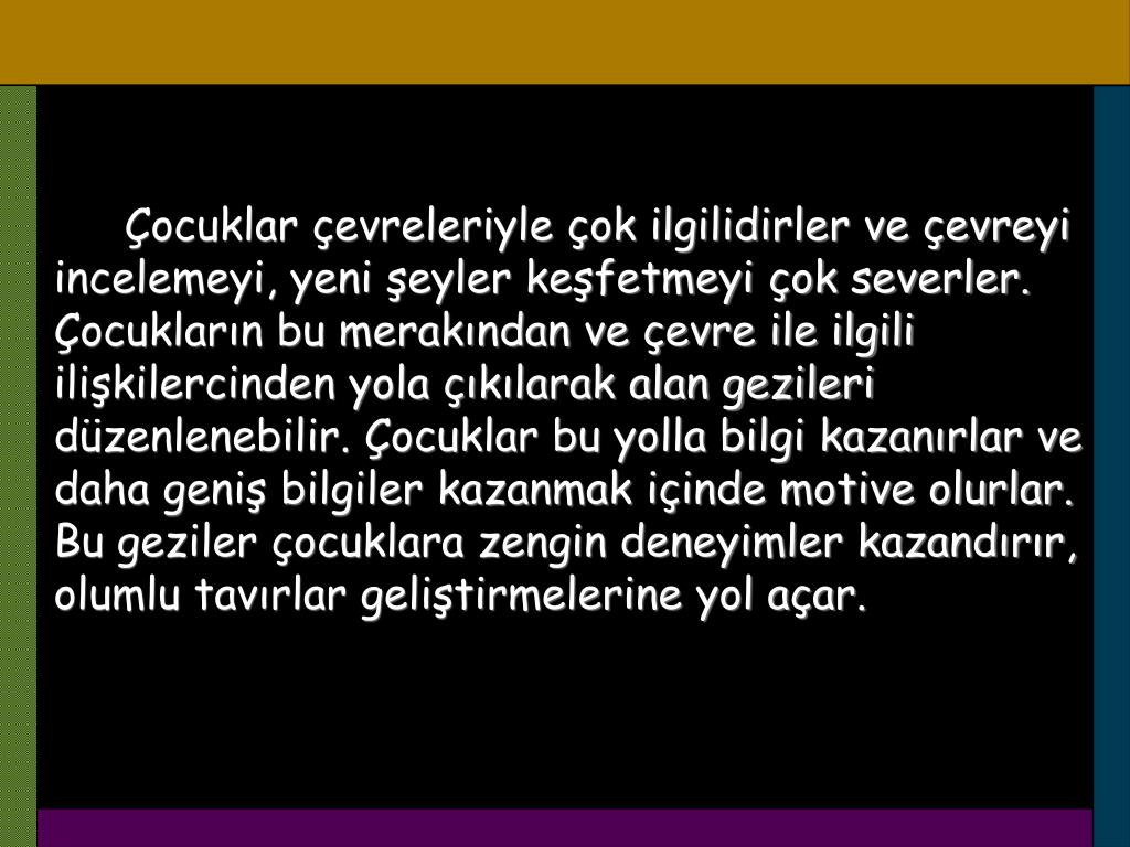Çocuklar çevreleriyle çok ilgilidirler ve çevreyi incelemeyi, yeni şeyler keşfetmeyi çok severler. Çocukların bu merakından ve çevre ile ilgili ilişkilercinden yola çıkılarak alan gezileri düzenlenebilir. Çocuklar bu yolla bilgi kazanırlar ve daha geniş bilgiler kazanmak içinde motive olurlar. Bu geziler çocuklara zengin deneyimler kazandırır, olumlu tavırlar geliştirmelerine yol açar.