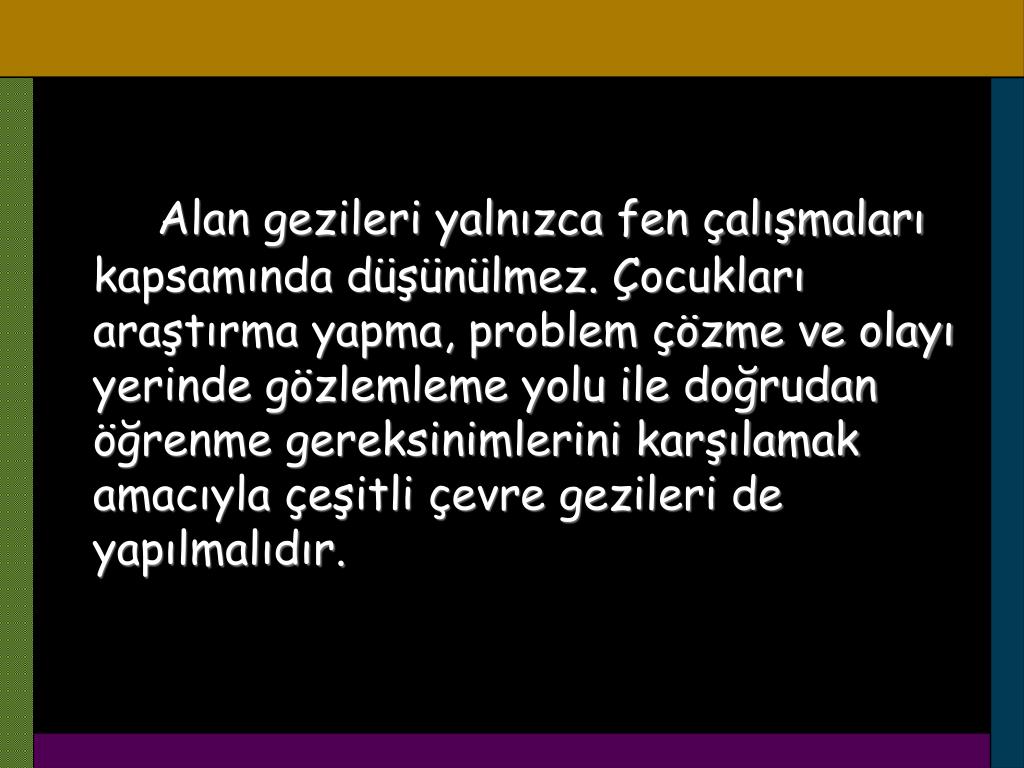 Alan gezileri yalnızca fen çalışmaları kapsamında düşünülmez. Çocukları araştırma yapma, problem çözme ve olayı yerinde gözlemleme yolu ile doğrudan öğrenme gereksinimlerini karşılamak amacıyla çeşitli çevre gezileri de yapılmalıdır.