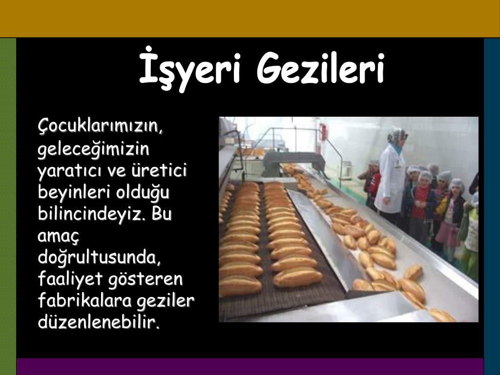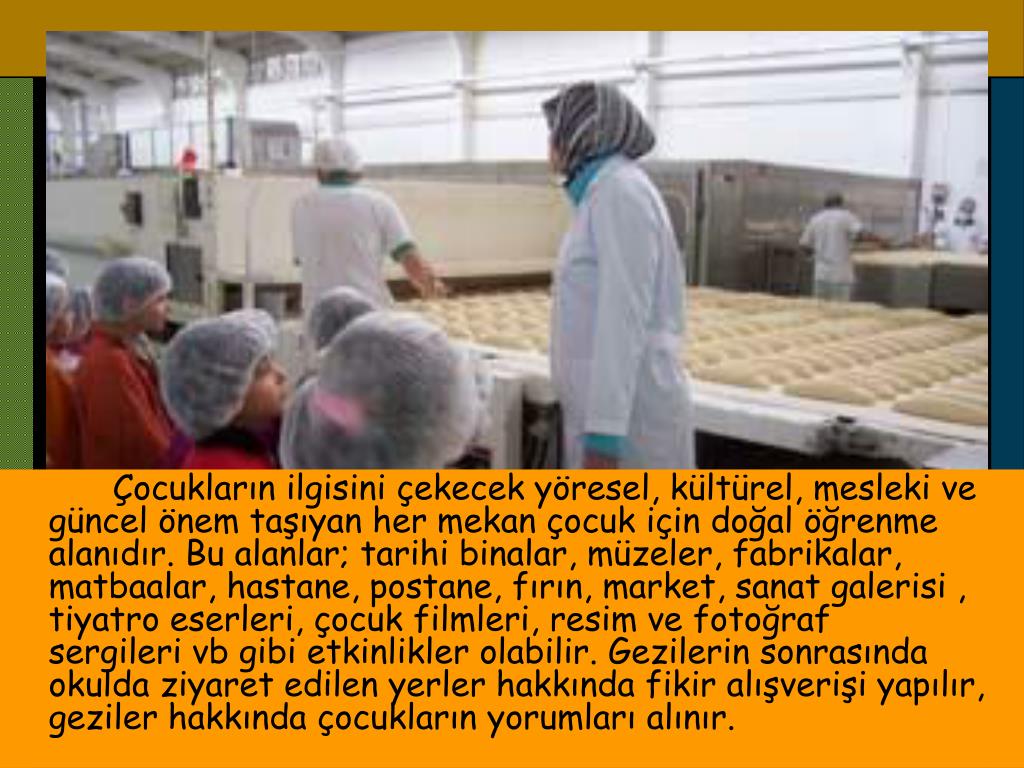 Bir üretim tesisini yâda bir fabrikayı ziyaretimizde, çocuklarımızın; Nasıl üretildiği, Nasıl yapıldığı, Kullanılan maddelerin neler olduğu ve hangi aşamalardan geçtiğini, Fabrikaların ülkemiz için neden önemli olduğunu, Fabrikalardaki makinelerin çalışma şekilleri gibi konularda karşılıklı soru-cevaplar tekniği ile mantık yürütmeleri beklenir. Gezi sonrasında Anaokuluna dönüldüğünde gezinin amacı ve önemi hakkında çocuklarımızla Karşılıklı konuşmalarla bilgileri pekiştirilir