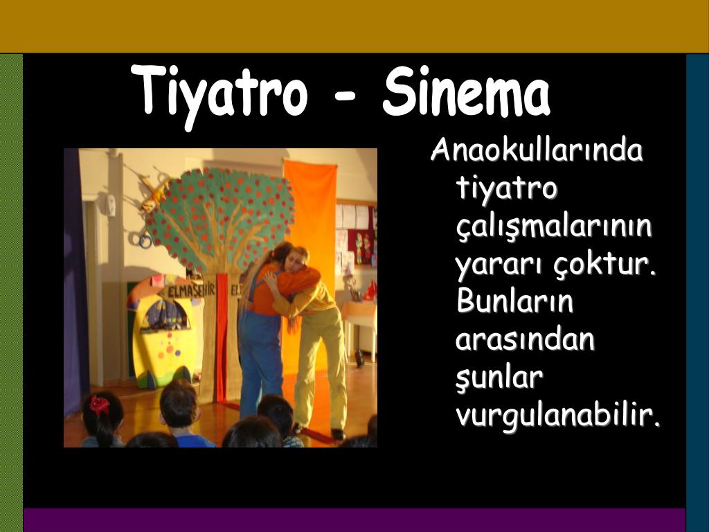 Anaokullarında tiyatro çalışmalarının yararı çoktur. Bunların arasından şunlar vurgulanabilir. Tiyatro - Sinema