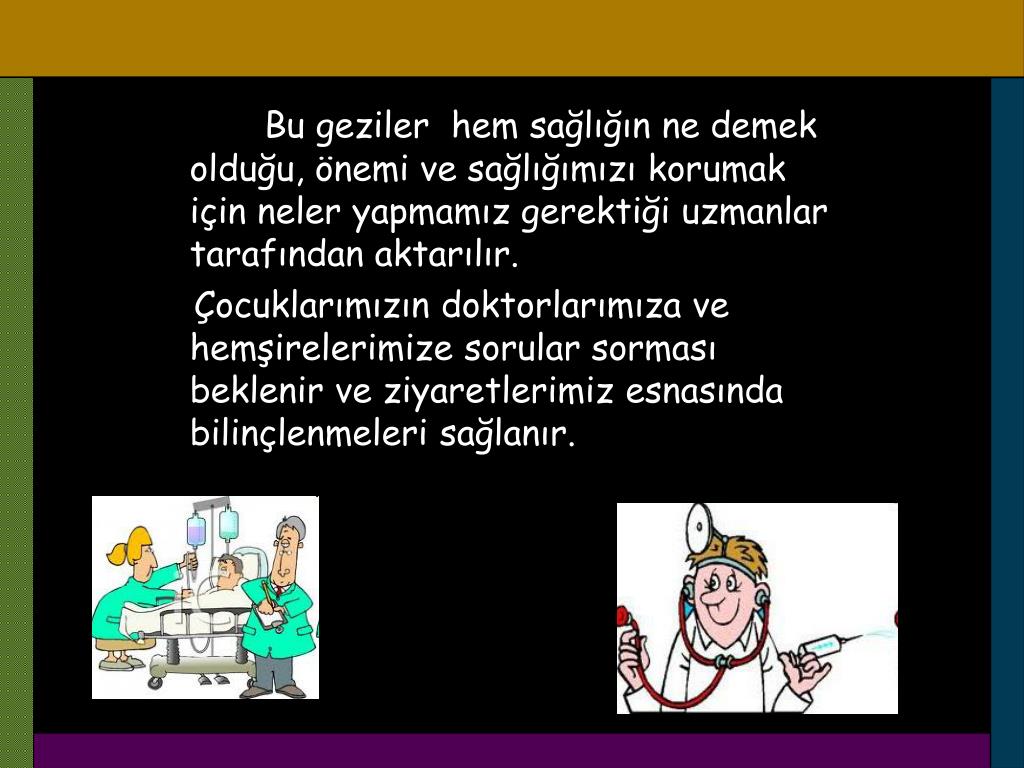 Bu geziler hem sağlığın ne demek olduğu, önemi ve sağlığımızı korumak için neler yapmamız gerektiği uzmanlar tarafından aktarılır. Çocuklarımızın doktorlarımıza ve hemşirelerimize sorular sorması beklenir ve ziyaretlerimiz esnasında bilinçlenmeleri sağlanır.