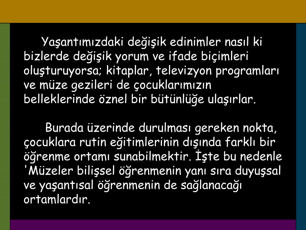 Yaşantımızdaki değişik edinimler nasıl ki bizlerde değişik yorum ve ifade biçimleri oluşturuyorsa; kitaplar, televizyon programları ve müze gezileri de çocuklarımızın belleklerinde öznel bir bütünlüğe ulaşırlar. Burada üzerinde durulması gereken nokta, çocuklara rutin eğitimlerinin dışında farklı bir öğrenme ortamı sunabilmektir. İşte bu nedenle 'Müzeler bilişsel öğrenmenin yanı sıra duyuşsal ve yaşantısal öğrenmenin de sağlanacağı ortamlardır.