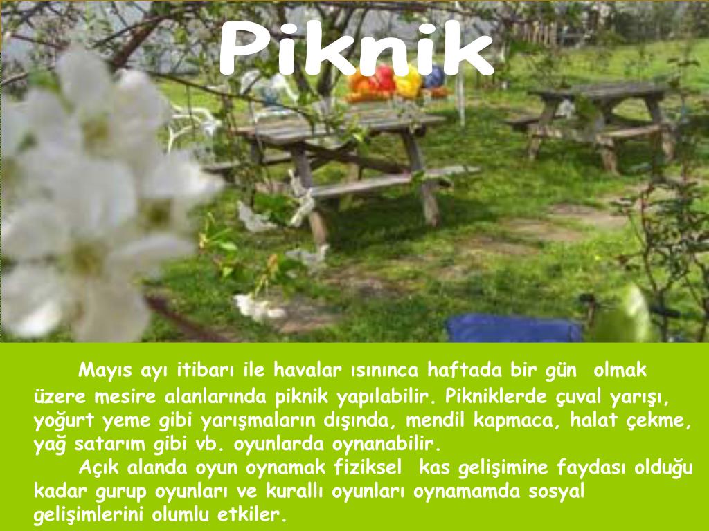 Mayıs ayı itibarı ile havalar ısınınca haftada bir gün olmak üzere mesire alanlarında piknik yapılabilir. Pikniklerde çuval yarışı, yoğurt yeme gibi yarışmaların dışında, mendil kapmaca, halat çekme, yağ satarım gibi vb. oyunlarda oynanabilir. Açık alanda oyun oynamak fiziksel kas gelişimine faydası olduğu kadar gurup oyunları ve kurallı oyunları oynamamda sosyal gelişimlerini olumlu etkiler. Piknik