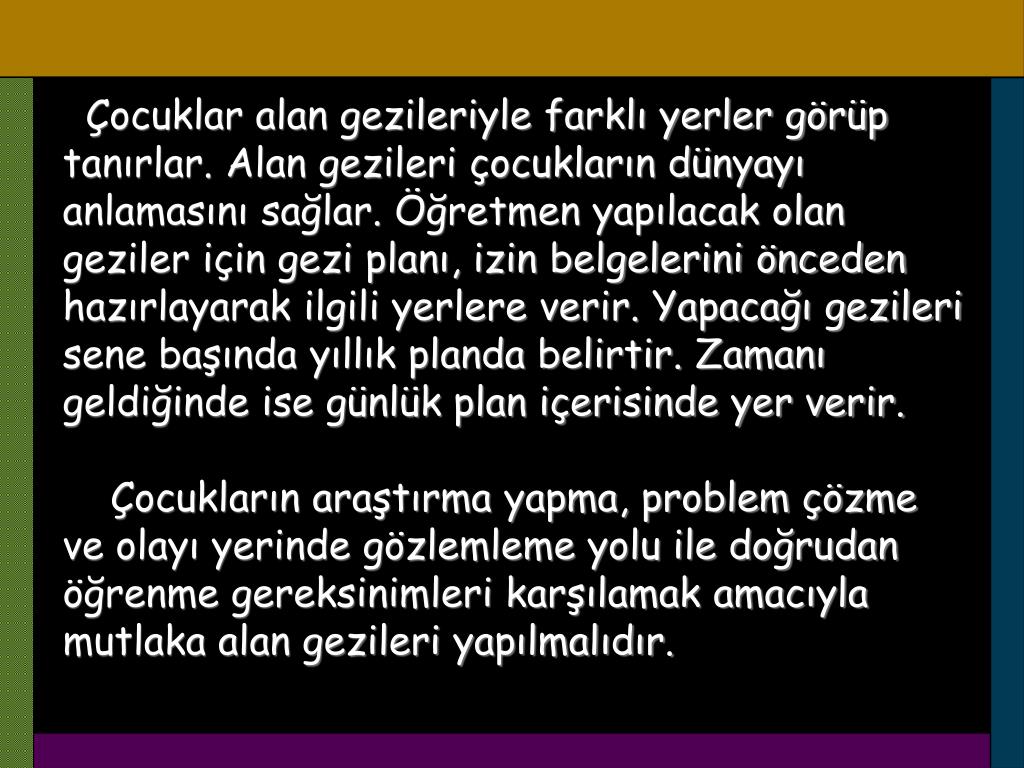 Alan Gezileri Alan gezileri çocukların tüm gelişim alanlarını desteklemektedir. Çocuklar gezilerde gözlem yapma, inceleme, merak duygularını giderme gibi fırsatlar bularak bilişsel gelişimle ilgili kavramları kazanmaktadırlar. Çocuğun çevresi ile iyi iletişim kurması, arkadaşları ile işbirliği yapması, grupla beraber çalışma, sorumluluğunu yerine getirme ve yaratıcılığın gelişmesi içinde bu tür geziler önemli fırsattır. Geziler çocukların yaparak yaşayarak öğrenmelerini sağlar. Çocukların yaşayarak öğrenmeleri bilgilerinin kalıcı olmasını sağlar.