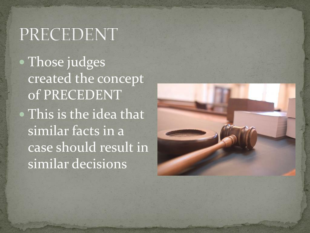 PRECEDENT • Those judges created the concept of PRECEDENT • This is the idea that similar facts in a case should result in similar decisions