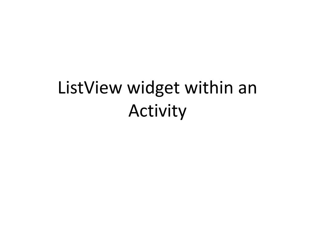 Sample .java code – ListActivity public class MyListActivity extends ListActivity { public void onCreate(Bundle savedInstanceState) { super.onCreate(savedInstanceState); //Note the absence of setContentView() call … setListAdapter(new ArrayAdapter<String> (this, android.R.layout.simple_list_item_1, myStringArray)); } }