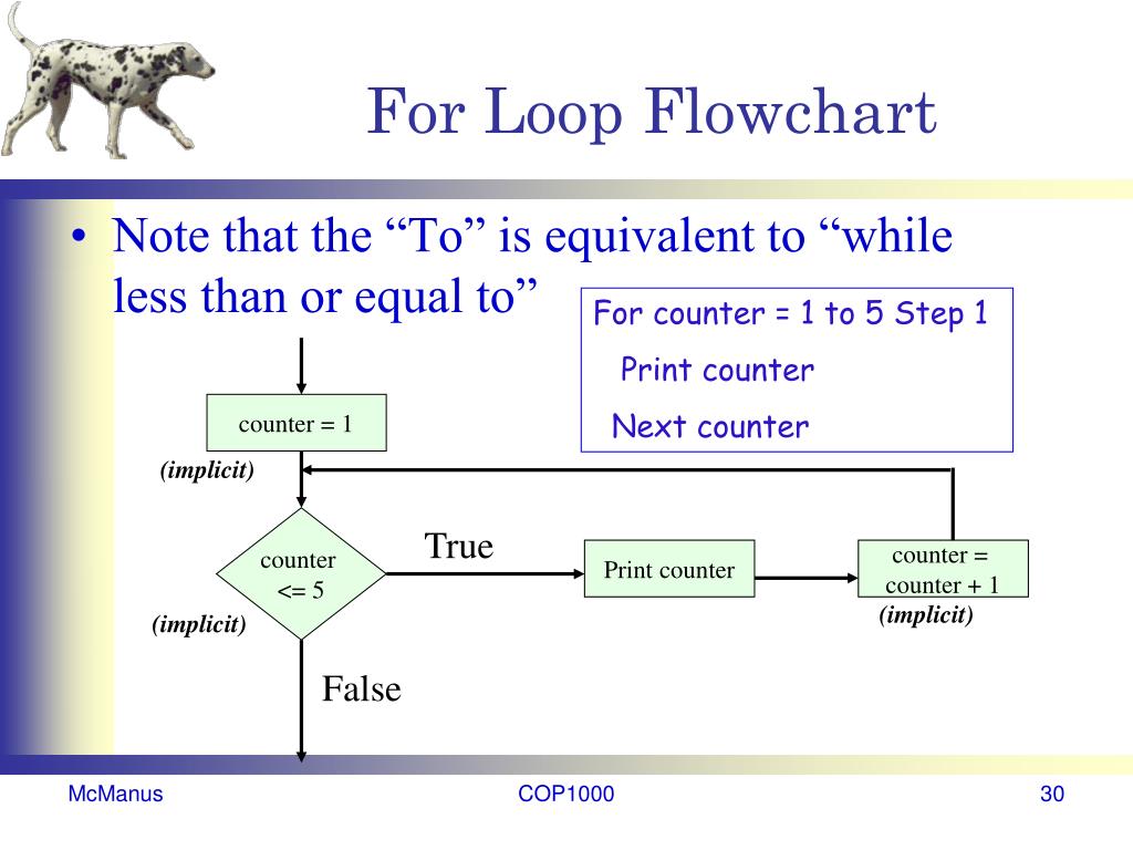 For Loop Flowchart • Note that the “To” is equivalent to “while less than or equal to” For counter = 1 to 5 Step 1 Print counter Next counter counter = 1 (implicit) counter <= 5 True Print counter counter = counter + 1 (implicit) (implicit) False COP1000