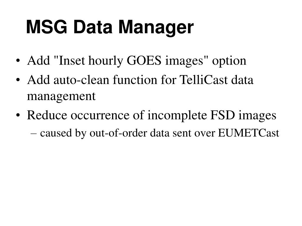 MSG Data Manager • Add "Inset hourly GOES images" option • Add auto-clean function for TelliCast data management • Reduce occurrence of incomplete FSD images • caused by out-of-order data sent over EUMETCast