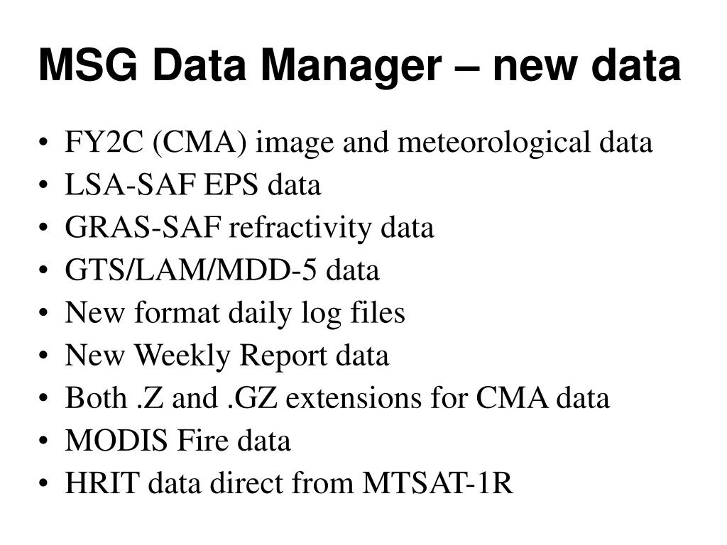 MSG Data Manager – new data • FY2C (CMA) image and meteorological data • LSA-SAF EPS data • GRAS-SAF refractivity data • GTS/LAM/MDD-5 data • New format daily log files • New Weekly Report data • Both .Z and .GZ extensions for CMA data • MODIS Fire data • HRIT data direct from MTSAT-1R