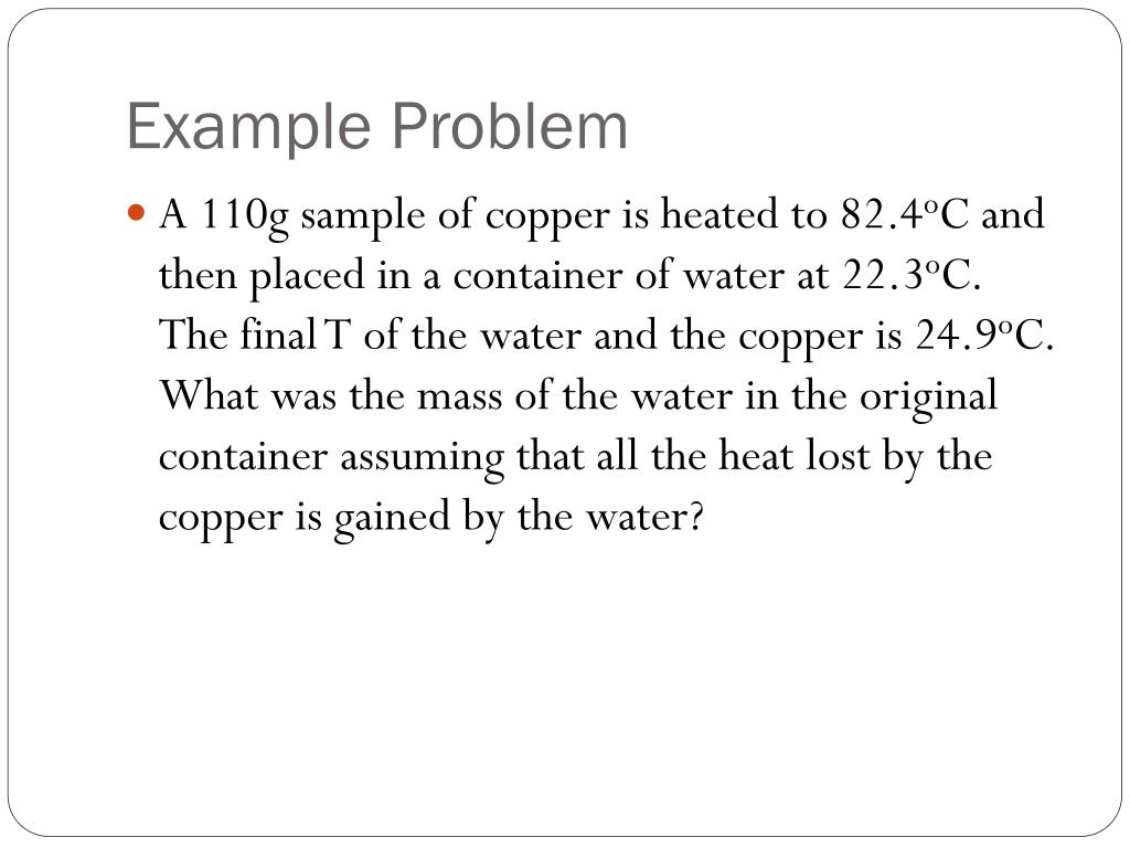 Example Problem • A 110g sample of copper is heated to 82.4oC and then placed in a container of water at 22.3oC. The final T of the water and the copper is 24.9oC. What was the mass of the water in the original container assuming that all the heat lost by the copper is gained by the water?