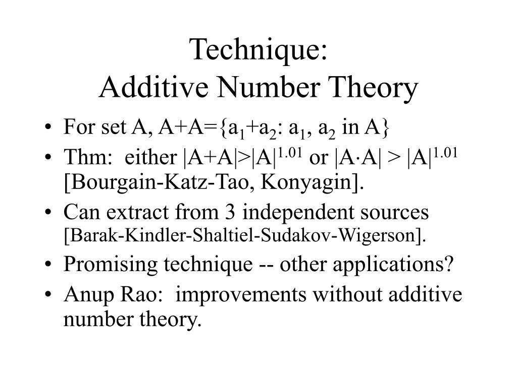 Technique:Additive Number Theory • For set A, A+A={a1+a2: a1, a2 in A} • Thm: either |A+A|>|A|1.01 or |AA| > |A|1.01 [Bourgain-Katz-Tao, Konyagin]. • Can extract from 3 independent sources [Barak-Kindler-Shaltiel-Sudakov-Wigerson]. • Promising technique -- other applications? • Anup Rao: improvements without additive number theory.