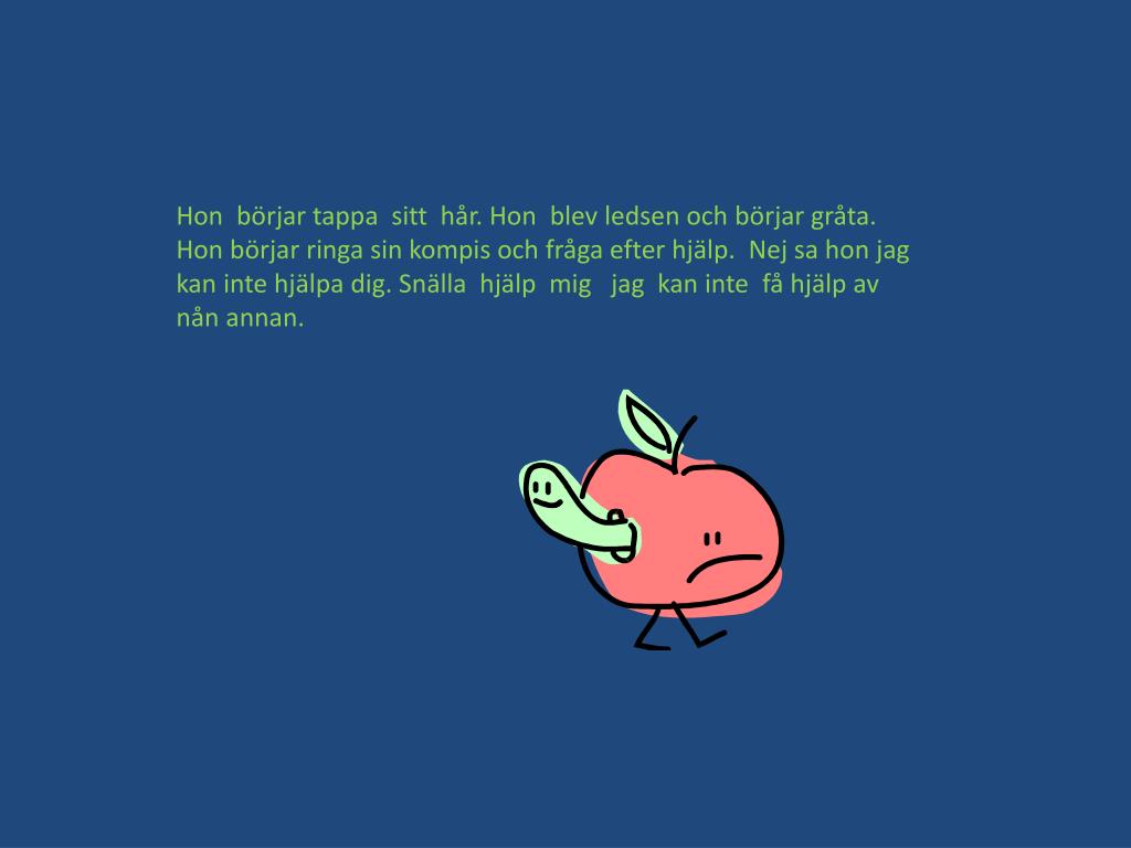 Hon börjar tappa sitt hår. Hon blev ledsen och börjar gråta. Hon börjar ringa sin kompis och fråga efter hjälp. Nej sa hon jag kan inte hjälpa dig. Snälla hjälp mig jag kan inte få hjälp av nån annan.