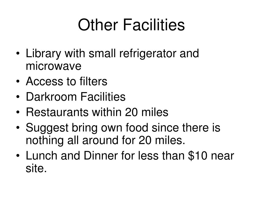 Other Facilities • Library with small refrigerator and microwave • Access to filters • Darkroom Facilities • Restaurants within 20 miles • Suggest bring own food since there is nothing all around for 20 miles. • Lunch and Dinner for less than $10 near site.