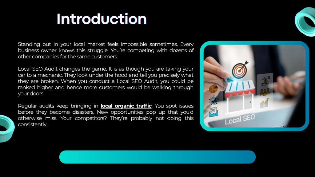 2. Introduction Introduction Introduction Standing out in your local market feels impossible sometimes. Every business owner knows this struggle. You’re competing with dozens of other companies for the same customers. Local SEO Audit changes the game. It is as though you are taking your car to a mechanic. They look under the hood and tell you precisely what they are broken. When you conduct a Local SEO Audit, you could be ranked higher and hence more customers would be walking through your doors. Regular audits keep bringing in local organic traffic. You spot issues before they become disasters. New opportunities pop up that you’d otherwise miss. Your competitors? They’re probably not doing this consistently.