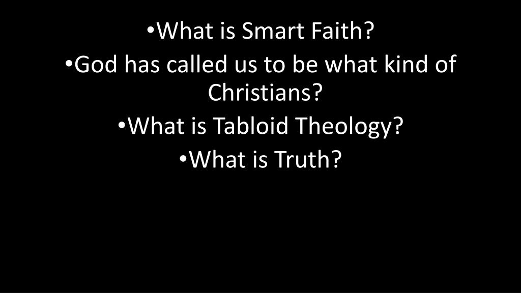 What is Smart Faith? • God has called us to be what kind of Christians? • What is Tabloid Theology? • What is Truth?