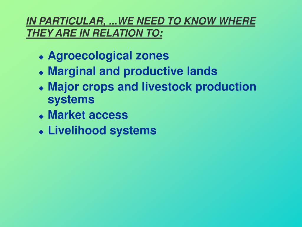 IN PARTICULAR, ...WE NEED TO KNOW WHERE THEY ARE IN RELATION TO: • Agroecological zones • Marginal and productive lands • Major crops and livestock production systems • Market access • Livelihood systems