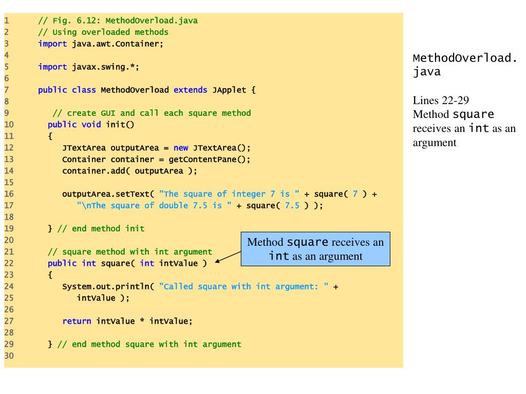 Method square receives an int as an argument 1 // Fig. 6.12: MethodOverload.java 2 // Using overloaded methods 3 import java.awt.Container; 4 5 import javax.swing.*; 6 7 public class MethodOverload extends JApplet { 8 9 // create GUI and call each square method 10 public void init() 11 { 12 JTextArea outputArea = new JTextArea(); 13 Container container = getContentPane(); 14 container.add( outputArea ); 15 16 outputArea.setText( "The square of integer 7 is " + square( 7 ) + 17 "\nThe square of double 7.5 is " + square( 7.5 ) ); 18 19 } // end method init 20 21 // square method with int argument 22 public int square( int intValue ) 23 { 24 System.out.println( "Called square with int argument: " + 25 intValue ); 26 27 return intValue * intValue; 28 29 } // end method square with int argument 30 MethodOverload.javaLines 22-29Method square receives an int as an argument