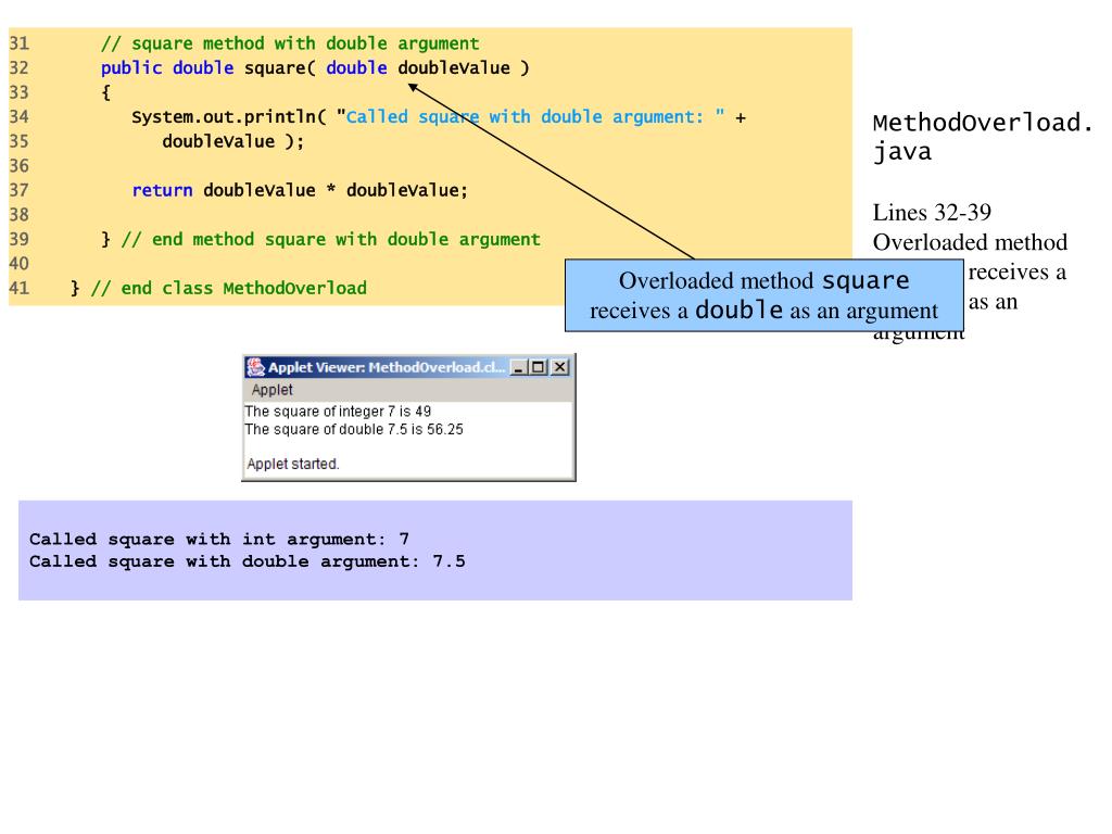 Overloaded method square receives a double as an argument 31 // square method with double argument 32 public double square( double doubleValue ) 33 { 34 System.out.println( "Called square with double argument: " + 35 doubleValue ); 36 37 return doubleValue * doubleValue; 38 39 } // end method square with double argument 40 41 } // end class MethodOverload MethodOverload.javaLines 32-39Overloaded method square receives a double as an argument Called square with int argument: 7 Called square with double argument: 7.5