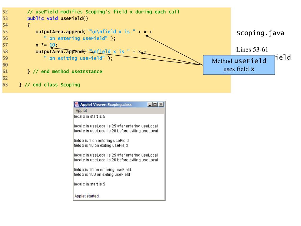 Method useField uses field x 52 // useField modifies Scoping's field x during each call 53 publicvoid useField() 54 { 55 outputArea.append( "\n\nfield x is " + x + 56 " on entering useField" ); 57 x *= 10; 58 outputArea.append( "\nfield x is " + x + 59 " on exiting useField" ); 60 61 } // end method useInstance 62 63 } // end class Scoping Scoping.javaLines 53-61Method useField uses field x