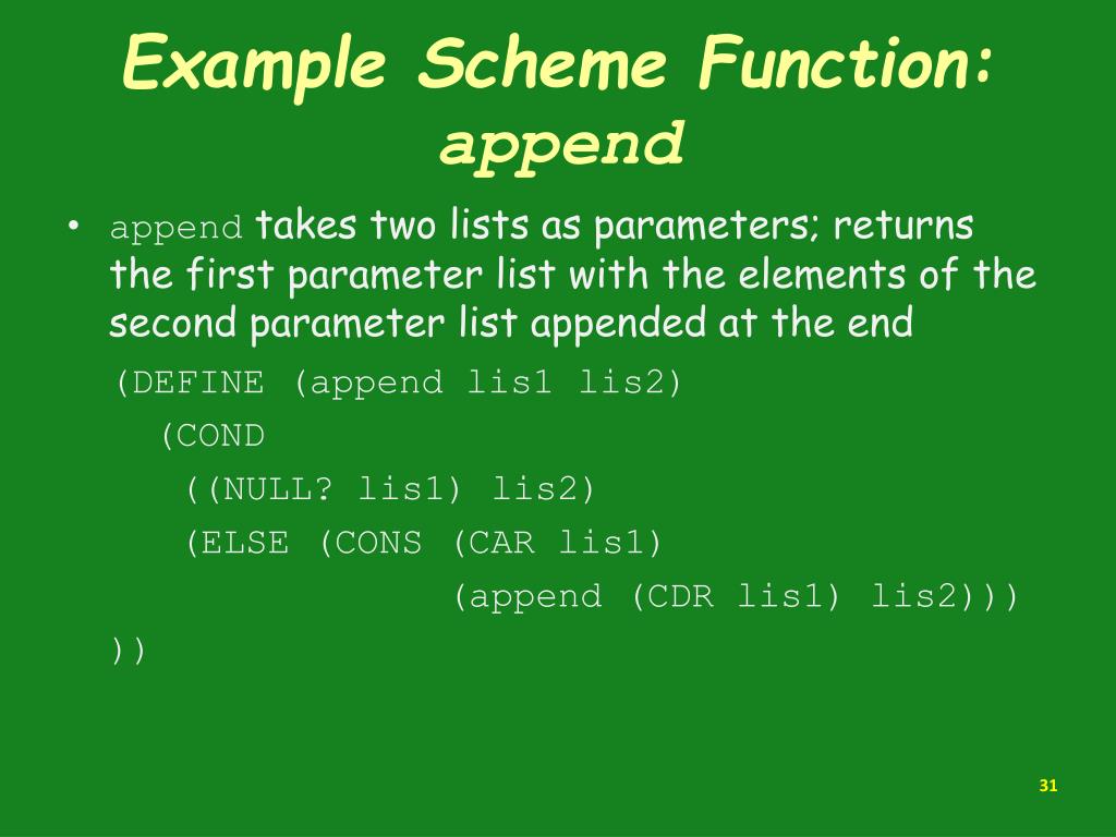 Example Scheme Function: append • append takes two lists as parameters; returns the first parameter list with the elements of the second parameter list appended at the end (DEFINE (append lis1 lis2) (COND ((NULL? lis1) lis2) (ELSE (CONS (CAR lis1) (append (CDR lis1) lis2))) ))