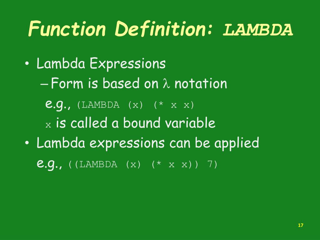 Function Definition: LAMBDA • Lambda Expressions • Form is based on notation e.g., (LAMBDA (x) (* x x) x is called a bound variable • Lambda expressions can be applied e.g., ((LAMBDA (x) (* x x)) 7)