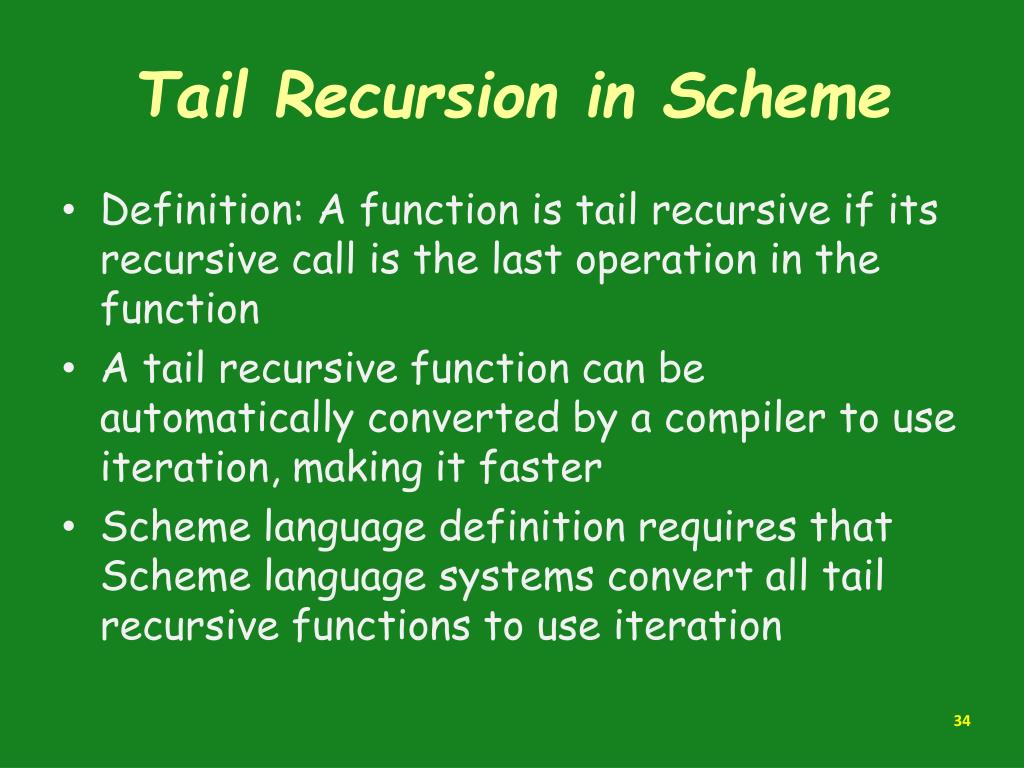 Tail Recursion in Scheme Definition: A function is tail recursive if its recursive call is the last operation in the function A tail recursive function can be automatically converted by a compiler to use iteration, making it faster Scheme language definition requires that Scheme language systems convert all tail recursive functions to use iteration
