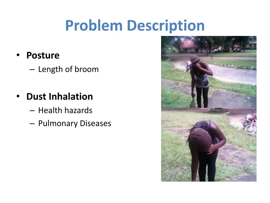 Problem Description • Posture • Length of broom • Dust Inhalation • Health hazards • Pulmonary Diseases