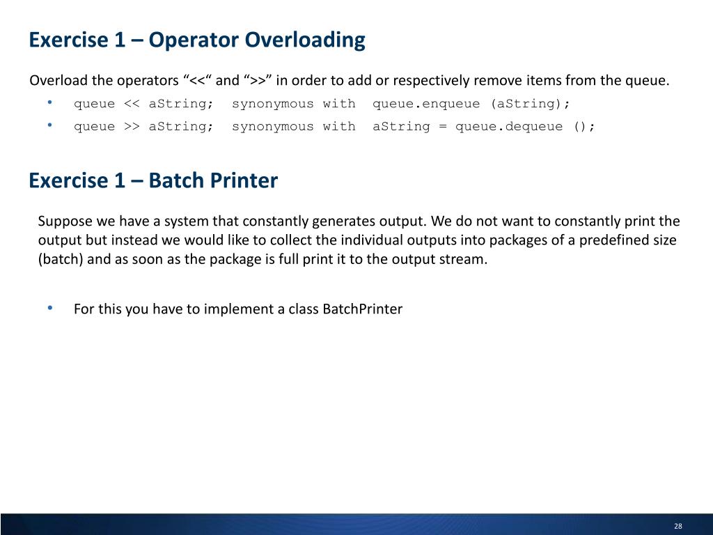 Exercise 1 – Operator Overloading • Overload the operators “<<“ and “>>” in order to add or respectively remove items from the queue. • queue << aString; synonymous with queue.enqueue (aString); • queue >> aString; synonymous with aString = queue.dequeue (); Exercise 1 – Batch Printer • Suppose we have a system that constantly generates output. We do not want to constantly print the output but instead we would like to collect the individual outputs into packages of a predefined size (batch) and as soon as the package is full print it to the output stream. • For this you have to implement a class BatchPrinter