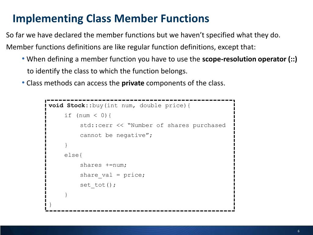 Implementing Class Member Functions • So far we have declared the member functions but we haven’t specified what they do. • Member functions definitions are like regular function definitions, except that: • When defining a member function you have to use the scope-resolution operator (::) • to identify the class to which the function belongs. • Class methods can access the private components of the class. void Stock::buy(int num, double price){ if (num < 0){ std::cerr << “Number of shares purchased cannot be negative”; } else{ shares +=num; share_val = price; set_tot(); } }