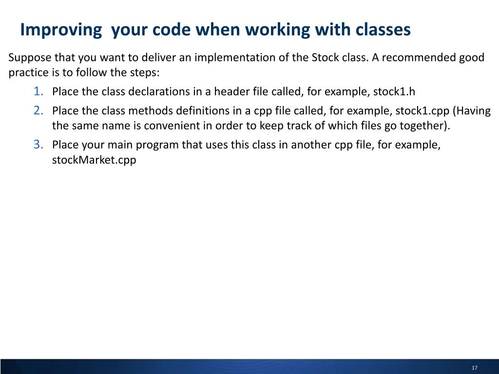 Improving your code when working with classes • Suppose that you want to deliver an implementation of the Stock class. A recommended good practice is to follow the steps: • Place the class declarations in a header file called, for example, stock1.h • Place the class methods definitions in a cpp file called, for example, stock1.cpp (Having the same name is convenient in order to keep track of which files go together). • Place your main program that uses this class in another cpp file, for example, stockMarket.cpp