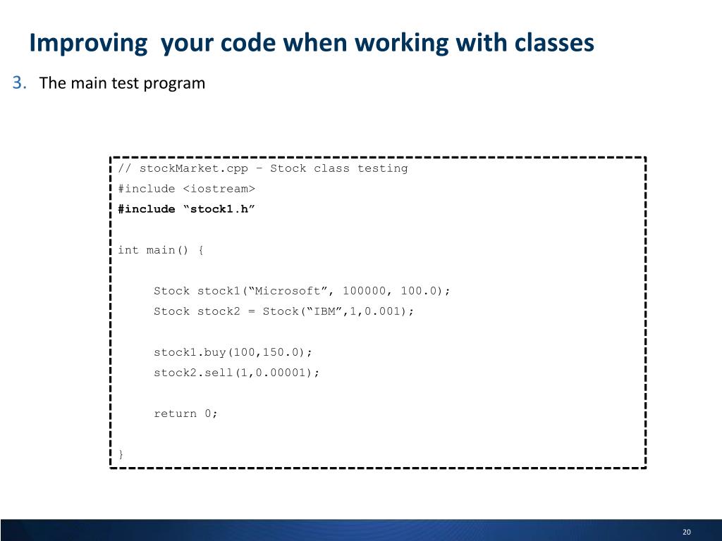 Improving your code when working with classes • The main test program // stockMarket.cpp – Stock class testing #include <iostream> #include “stock1.h” int main() { Stock stock1(“Microsoft”, 100000, 100.0); Stock stock2 = Stock(“IBM”,1,0.001); stock1.buy(100,150.0); stock2.sell(1,0.00001); return 0; }