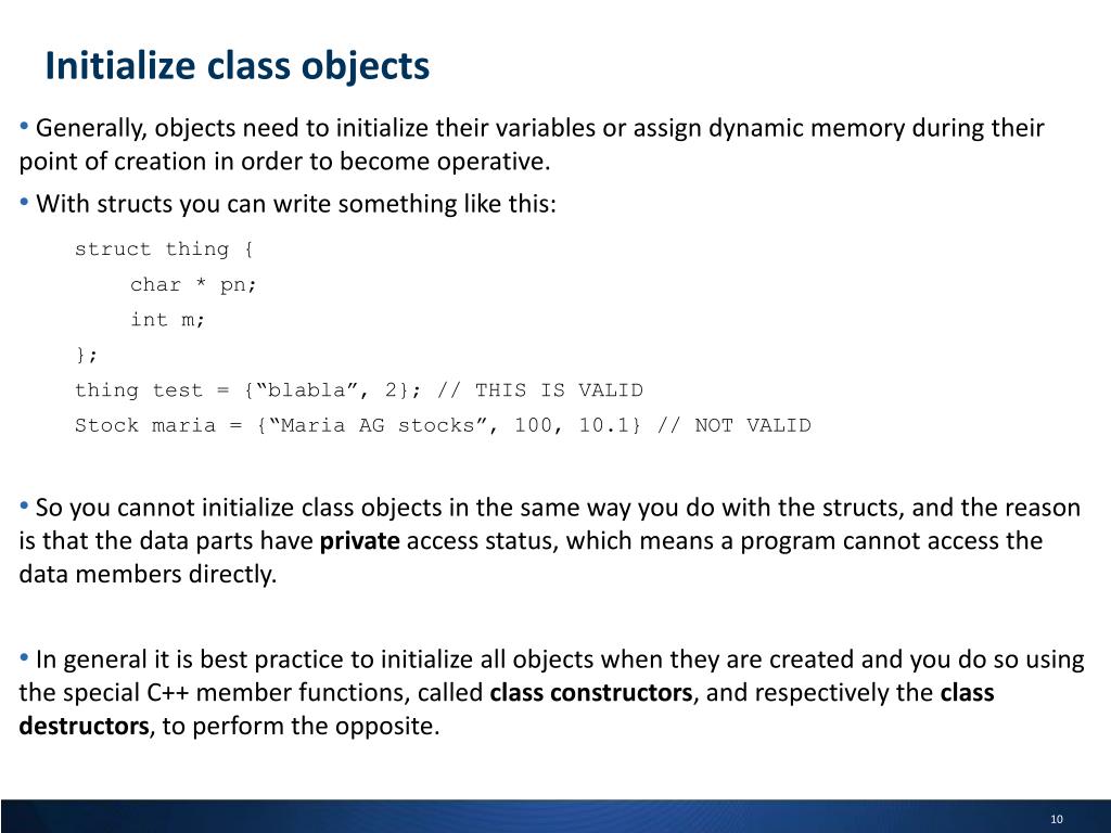 Initialize class objects • Generally, objects need to initialize their variables or assign dynamic memory during their point of creation in order to become operative. • With structs you can write something like this: • struct thing { • char * pn; • int m; • }; • thing test = {“blabla”, 2}; // THIS IS VALID • Stock maria = {“Maria AG stocks”, 100, 10.1} // NOT VALID • So you cannot initialize class objects in the same way you do with the structs, and the reason is that the data parts have private access status, which means a program cannot access the data members directly. • In general it is best practice to initialize all objects when they are created and you do so using the special C++ member functions, called class constructors, and respectively the class destructors, to perform the opposite.