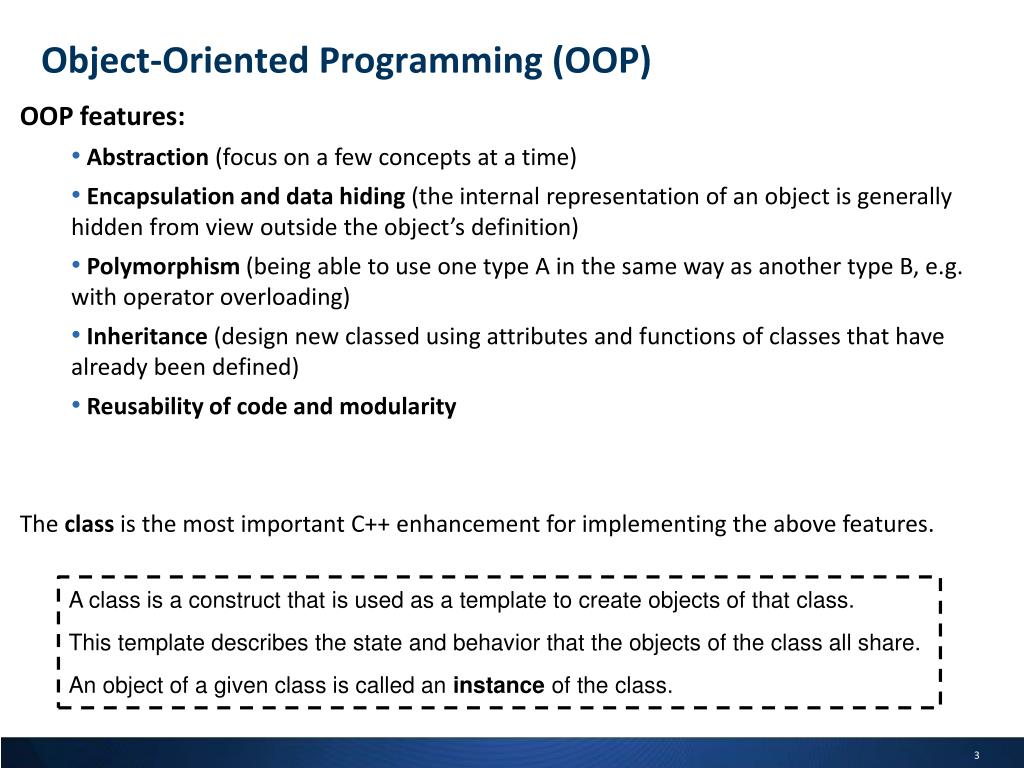 Object-Oriented Programming (OOP) • OOP features: • Abstraction (focus on a few concepts at a time) • Encapsulation and data hiding (the internal representation of an object is generally hidden from view outside the object’s definition) • Polymorphism (being able to use one type A in the same way as another type B, e.g. with operator overloading) • Inheritance (design new classed using attributes and functions of classes that have already been defined) • Reusability of code and modularity • The class is the most important C++ enhancement for implementing the above features. A class is a construct that is used as a template to create objects of that class. This template describes the state and behavior that the objects of the class all share. An object of a given class is called an instance of the class.
